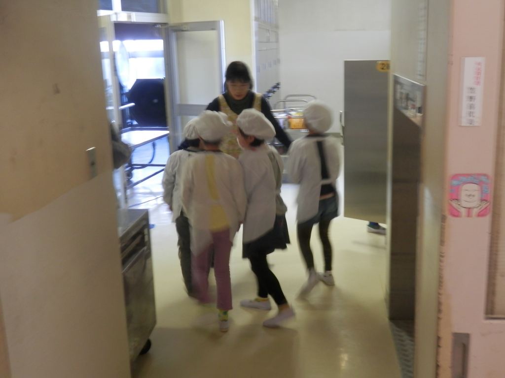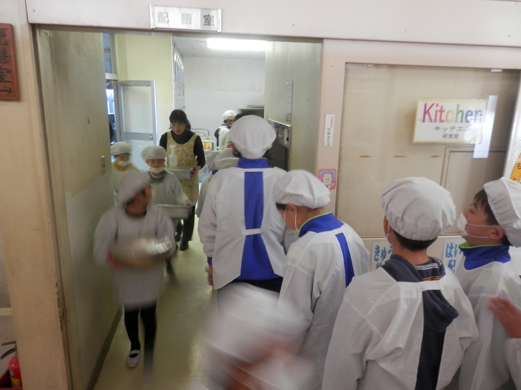 毎日の配膳は、給食当番の子供たちがしています。給食室に入る時、「〇年〇組です。おいしい給食をいただきにきました。」と大きな声で栄養教諭の笠野先生や調理員さんに向けてあいさつします。服装を整え、上手に配膳しています。感謝の気持ちを元気なあいさつでお返ししましょう。