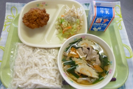 牛乳 肉うどん サーターアンダギー ジャコ入り大根サラダ