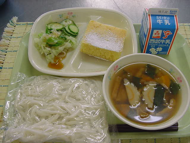牛乳 五目うどん オレンジパンケーキ 温野菜ドレッシング