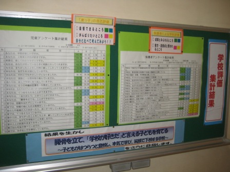 学期末に学校評価として保護者アンケート、児童アンケート、教職員自己評価を行いました。学校評価結果をこれからの教育活動に生かしていきたいと考えています。保護者・児童アンケート結果を校内にも掲示しました。