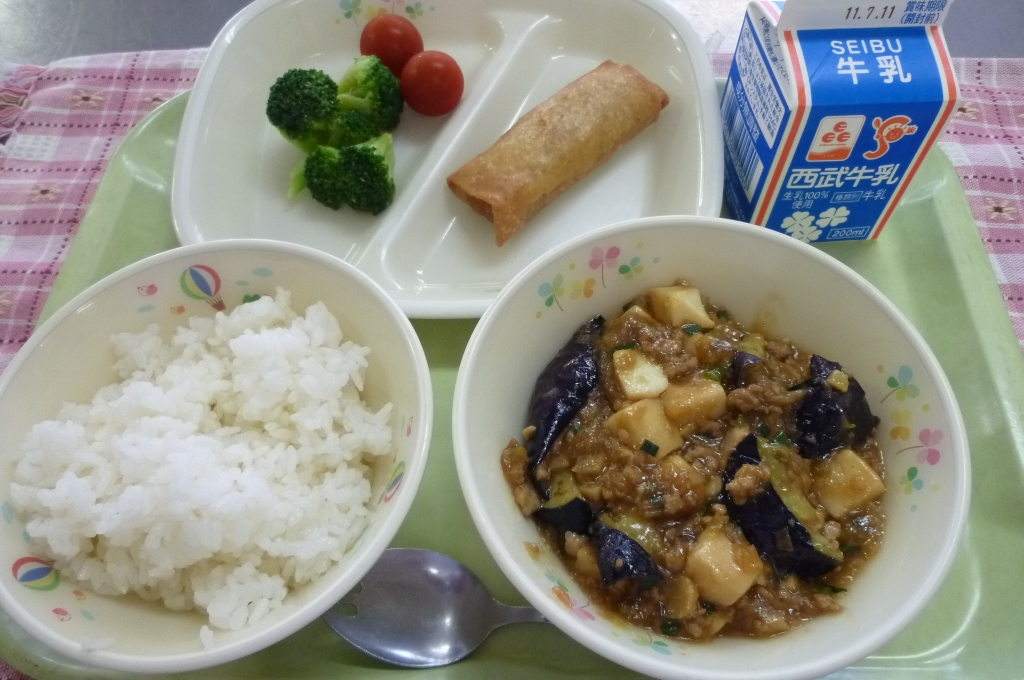 牛乳 ご飯 春巻き マーボーナス豆腐 ブロッコリー