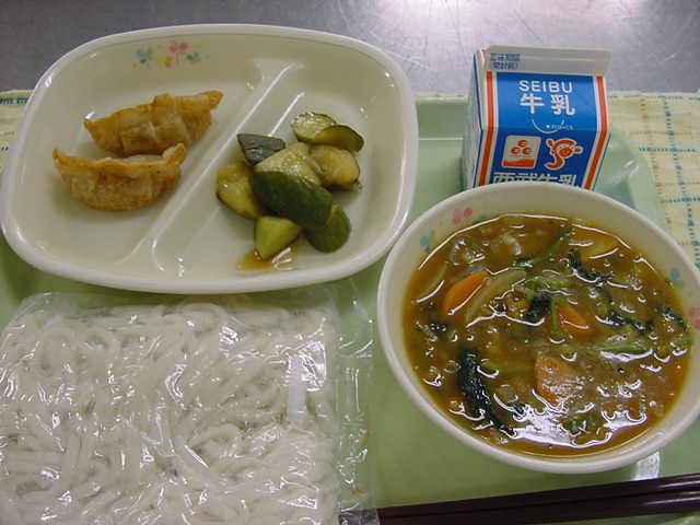 牛乳 カレーうどん 揚げ餃子 中華きゅうり
